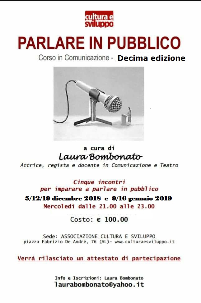 L’ultimo incontro sarà dedicato alla presentazione di un discorso in pubblico da parte di ciascun partecipante nella sala conferenze dell’Associazione Cultura e Sviluppo, con l’utilizzo del microfono e con una videocamera che la riprenderà (e che a richiesta sarà possibile avere, portando una chiavetta USB).