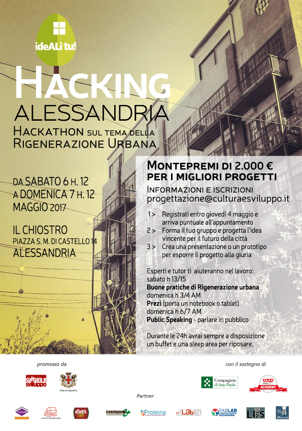 Insieme si è così organizzato sabato 6 e domenica 7 maggio il primo Hackathon di rigenerazione urbana della città di Alessandria: 24 ore presso il Chiostro di Santa Maria di Castello dove 20 giovani divisi in team di 4-5 persone si sono sfidati alla ricerca della proposta più innovativa per (ri)attivare nuovamente aree o parti della città. In palio l’orgoglio di vincere la sfida e un mini montepremi messi a disposizione da Coop Academy.