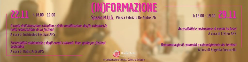Sabato 29 novembre, h 16.00-19.00 – Incontro di formazione con LISten APS ed Eugenia Coscarella (dramaturg di comunità per Lavanderia a Vapore e Fondazione Piemonte dal Vivo), in collaborazione con Associazione Cultura e Sviluppo