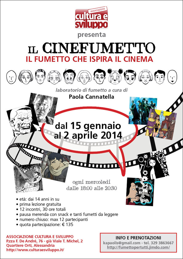 Dal 15 gennaio comincia il secondo laboratorio intitolato al “Cinefumetto”: attraverso il confronto diretto fra fumetti di genere e origine diversi (comics americani, bandes déssinées francesi, manga, romanzi a fumetti) e i film che da loro hanno preso ispirazione si evidenziano le peculiarità della letteratura disegnata con esercizi finalizzati all’apprendimento di tecniche di disegno e narrazione dei grandi fumettisti a cui il cinema deve la propria fortuna.