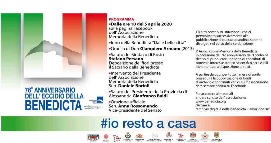 L’emergenza sanitaria in corso impedisce la celebrazione dell’anniversario del 76° anniversario della strage della Benedicta nei modi consueti e nei luoghi dell’eccidio.