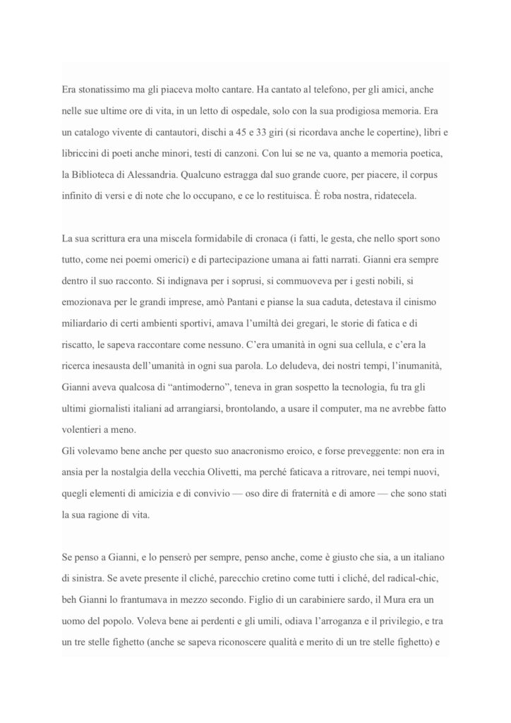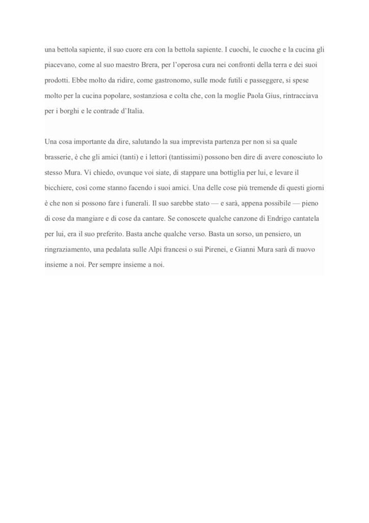 Bene ha scritto Gigi Garanzini su «La Stampa»: «Caro Gianni, finiranno anche questi giorni maledetti e troveremo il posto e il modo di ricordarti tutti insieme. Noi senzabrera, uno dei tuoi tanti fior di conio, da oggi anche senzamura»