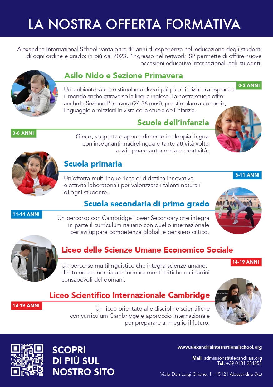 Alexandria International School è un’istituzione scolastica con oltre 40 anni di esperienza nell’educazione di qualità, offrendo percorsi completi dall’infanzia fino al diploma di maturità. Dal 2023, facciamo parte di International Schools Partnership (ISP), una network globale di eccellenza educativa con oltre 111 scuole in 25 paesi, che garantisce ai nostri studenti l’accesso a un apprendimento internazionale e innovativo.
