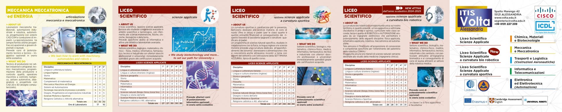 L’Istituto “A. Volta” è una scuola vocata alla ricerca scientifica, allo sviluppo della scienza e della tecnologia, dove le materie davvero caratterizzanti sono la matematica, la fisica, le scienze naturali (per il polo liceale) la chimica, l’informatica, il disegno tecnico e tutto l’aspetto legato alla robotica specifica per ogni indirizzo.
