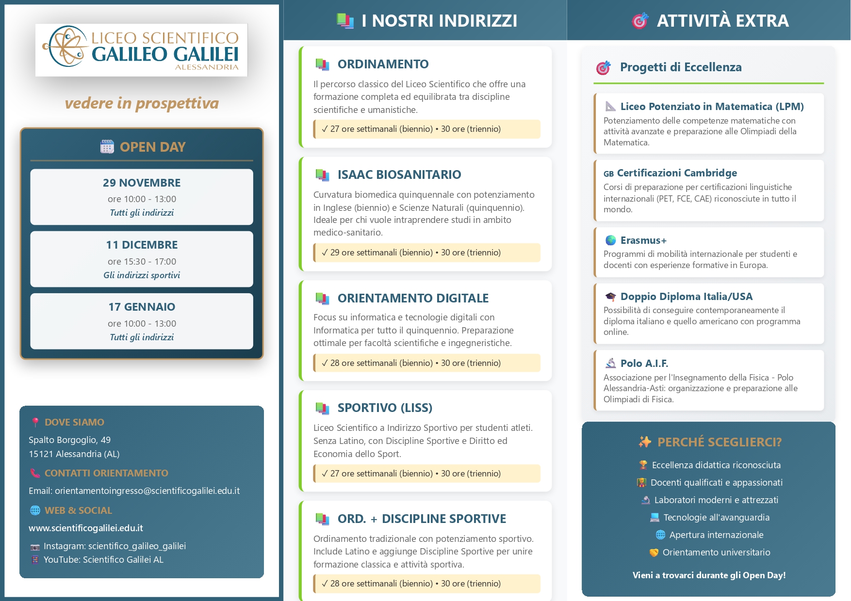 Il Liceo scientifico G. Galilei è il Liceo in cui si sono formate intere generazioni di studenti e centinaia di professionisti dei diversi settori.