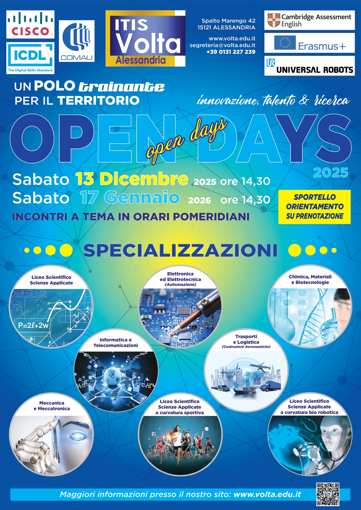 L’Istituto di Istruzione Superiore “Alessandro Volta” è un polo tecnico scientifico ubicato nel cuore di Alessandria all’interno del quale gravitano in perfetta armonia due poli scientifici: il liceo scientifico delle scienze applicate, anche a curvatura sportiva e cinque indirizzi tecnici: