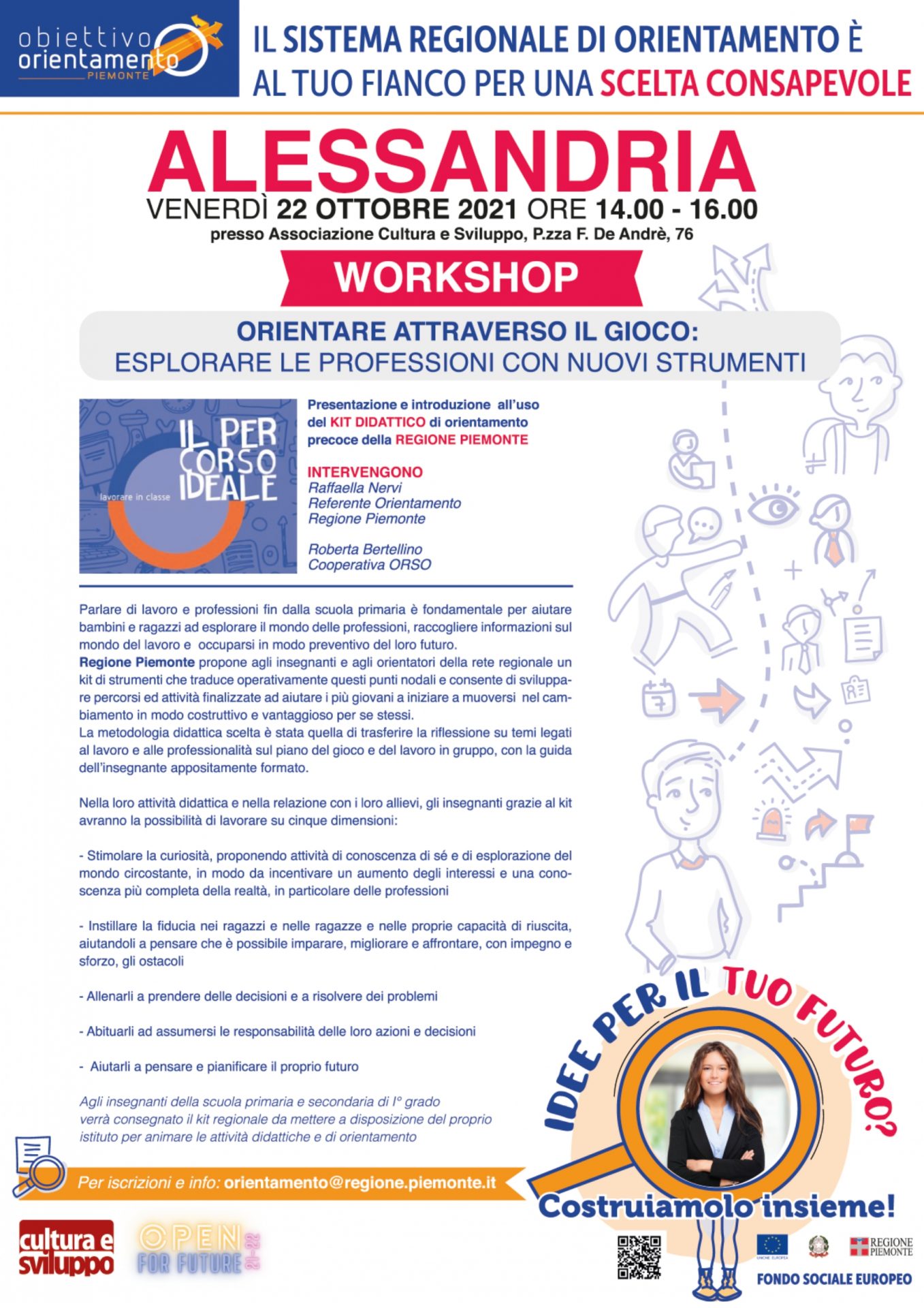 In occasione sel Salone dell’orientamento scolastico OPEN FOR FUTURE 2021-2022, la presentazione del kit si terrà venerdì 22 ottobre, alle ore 14, presso la sede di Associazione Cultura e Sviluppo in Piazza F.De Andrè 76 ad Alessandria.