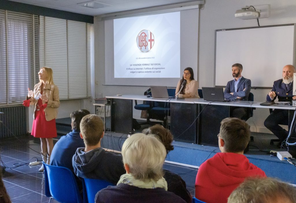 L’idea, nata su proposta dei Grigi all’interno del Progetto 3P (Patto – Passione – Partecipazione) messo in campo dalla Lega Pro e dall’Osservatorio per le Manifestazioni Sportive, ha visto protagonisti i rappresentanti di classe (circa 70 studenti in totale) dell’Itis Volta, invitati a partecipare all’incontro dalla dirigente scolastica Maria Elena Dealessi, che ha aderito subito con entusiasmo alla proposta dell’Alessandria Calcio: “è importante parlare di questa tematica, così come del cyberbullismo, e coinvolgere i ragazzi in momenti formativi che li aiutino a maturare più consapevolezza rispetto all’utilizzo quotidiano che fanno degli strumenti tecnologici oggi disponibili”.