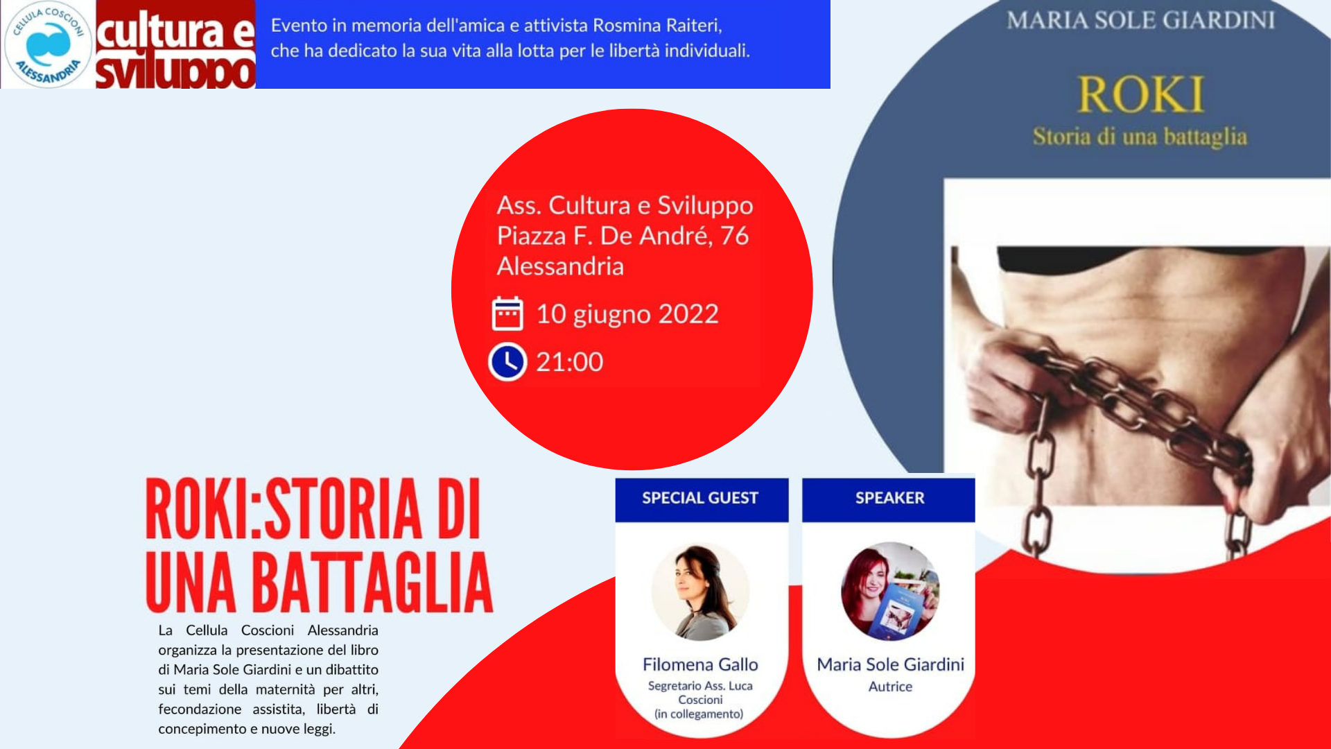 Venerdì 10 giugno alle ore 21 Maria Sole Giardini presenterà il suo libro Roki, storia di una battaglia (Edizioni italiane), in cui racconta della lotta intrapresa per vedere riconosciuto il diritto ad avere un bambino, diritto suo e di tante famiglie che non possono avere figli naturalmente. Filomena Gallo, segretario nazionale dell’Associazione Luca Coscioni, interverrà in collegamento sulla libertà di procreazione, con approfondimenti su gestazione per altri e fecondazione assistita (è raccomandata la prenotazione del posto in sala tramite il form in fondo alla pagina).